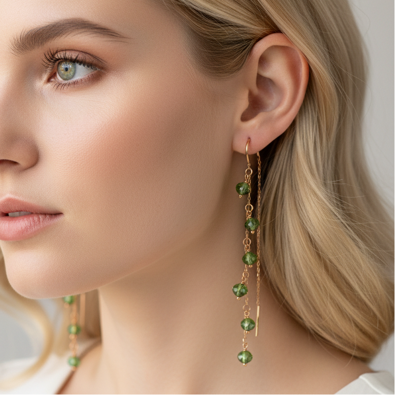 Perfect for both everyday wear and evening occasions, a graceful fusion of delicate gold and vibrant green beads that sway with every movement