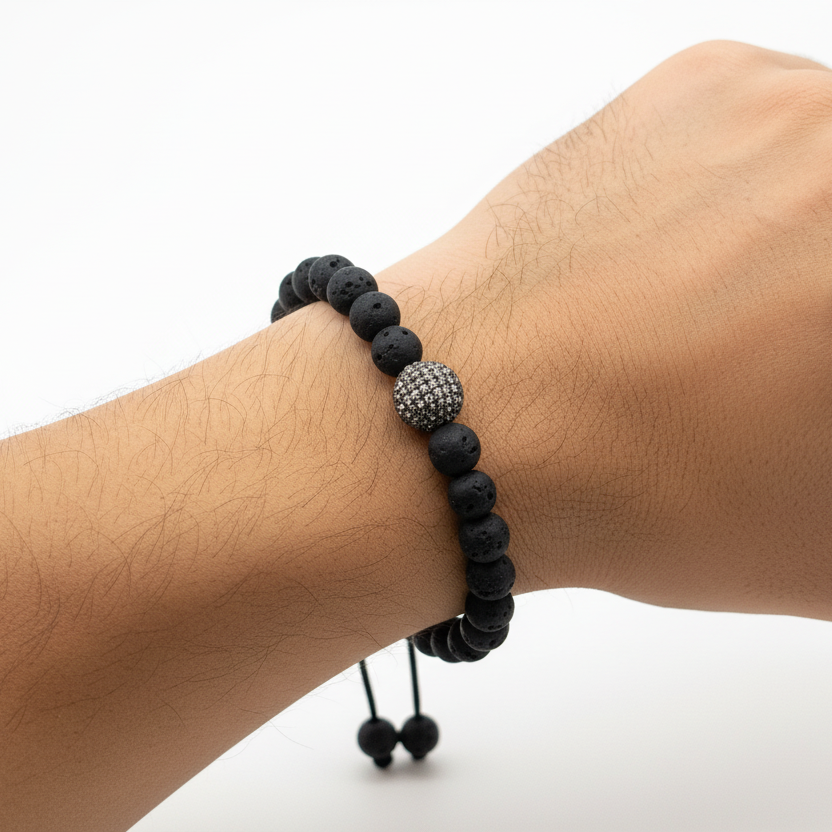18 karat gold"Bold and timeless, the volcanic essence bracelet combines the raw strength of black lava beads with effortless style. Elevate your look today!"Zirconium and Gold