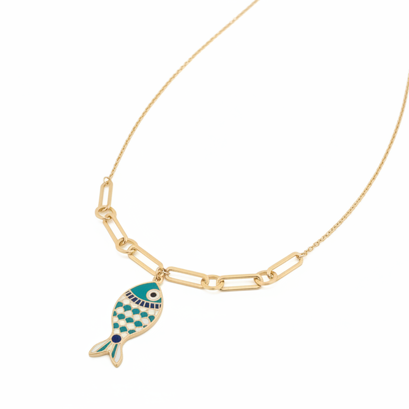 18 Karat Yellow NecklaceFish Gold 2cm lengthEnamel: Tiffany Blue WhiteChain: 40cmADJUSTABLE SIZE AND COLORS